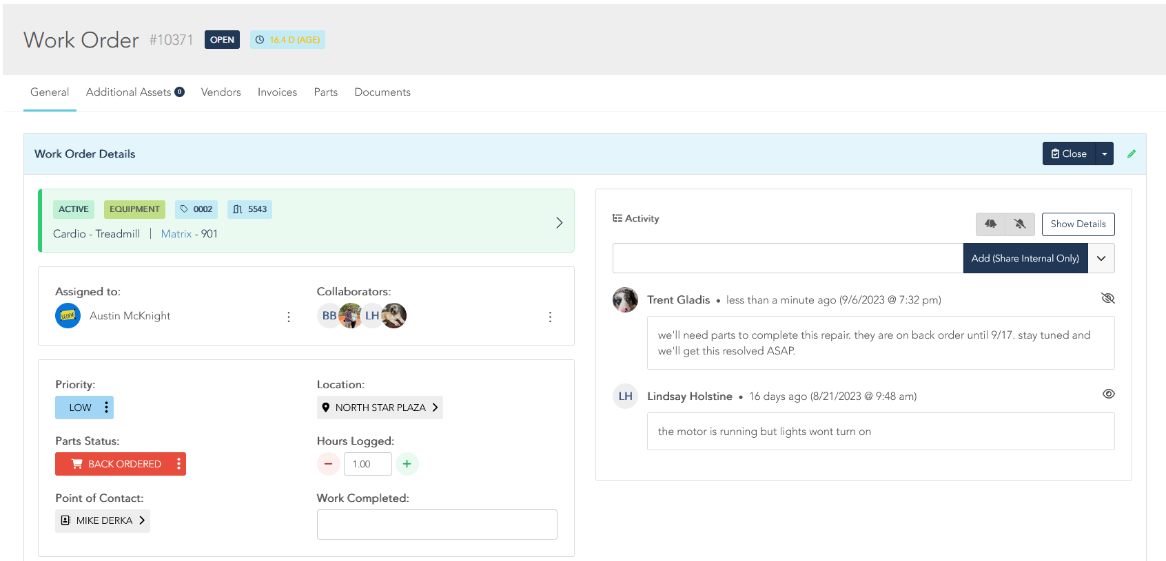 Now on the “General” page of the work order, you will be able to see the details of the work order as well as information on the impacted asset or facility issue.