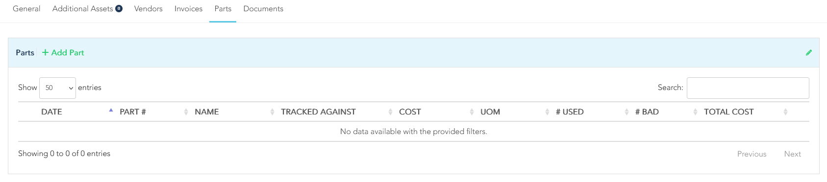 - “Parts” tab – if any parts (either from your company’s inventories or from a vendor) were used during the work order, track them here.