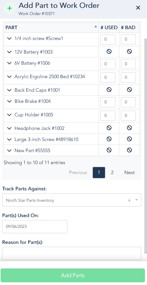 - Parts – this drop-down menu allows you to identify the status of parts: