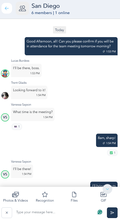 While in Team Chat, you can send an image or video, file, GIF, or give a Recognition by clicking the paperclip icon to the left of the, "Type a new message..." box.