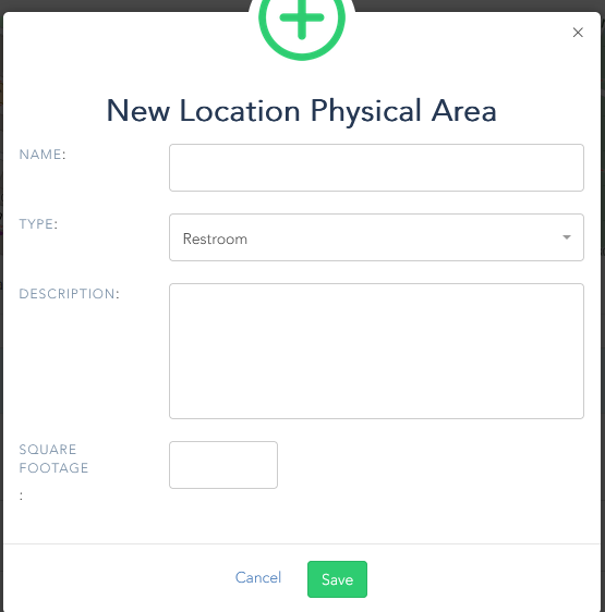 1. Click on the green “+ Add Physical Area” text to open up the “New Location Physical Area” pop-up window.