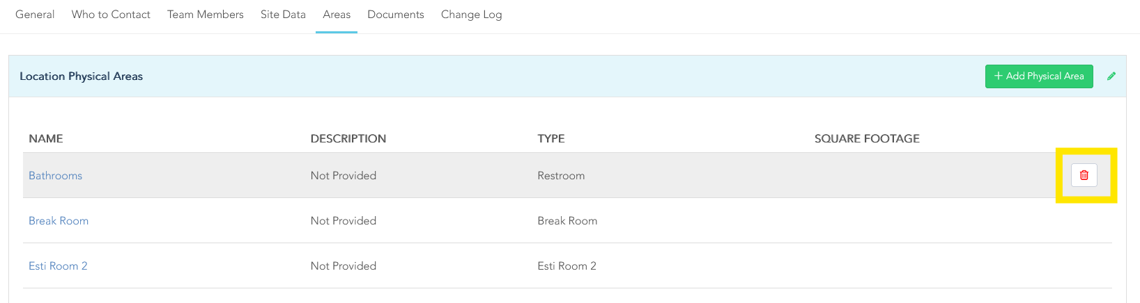 The Location 'Areas' tab allows you to track the physical areas that make up your location (e.g., waiting room, women’s restroom, office, etc.)