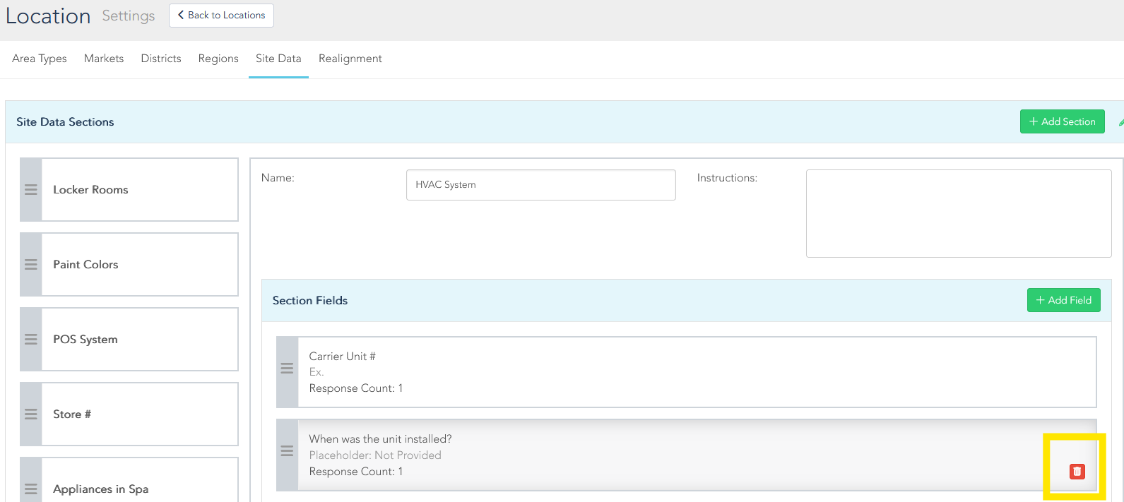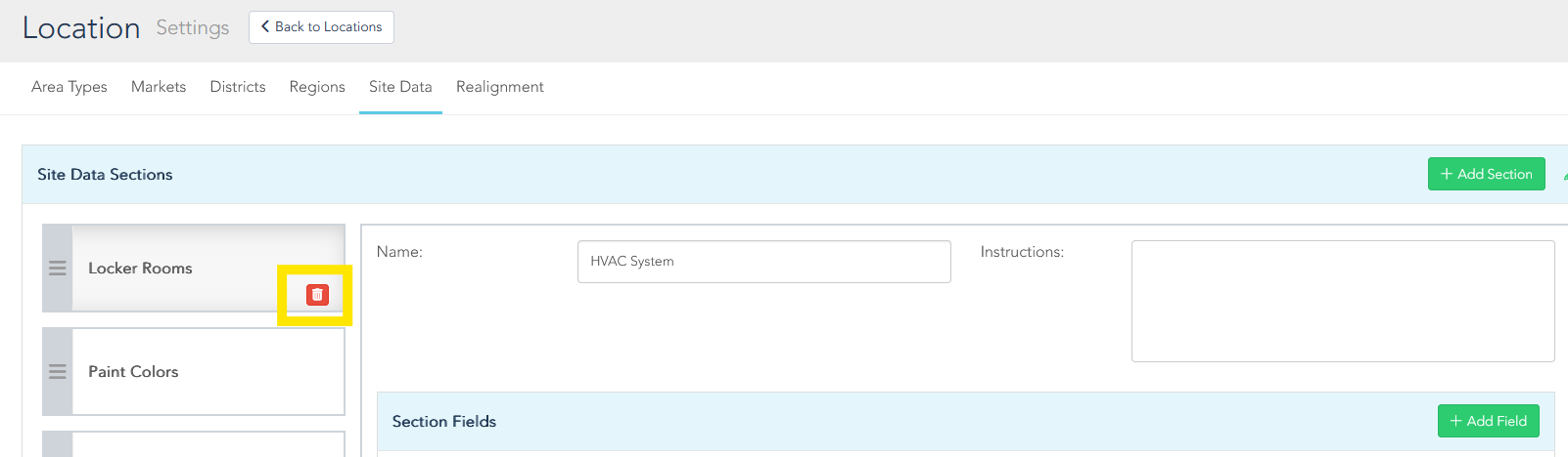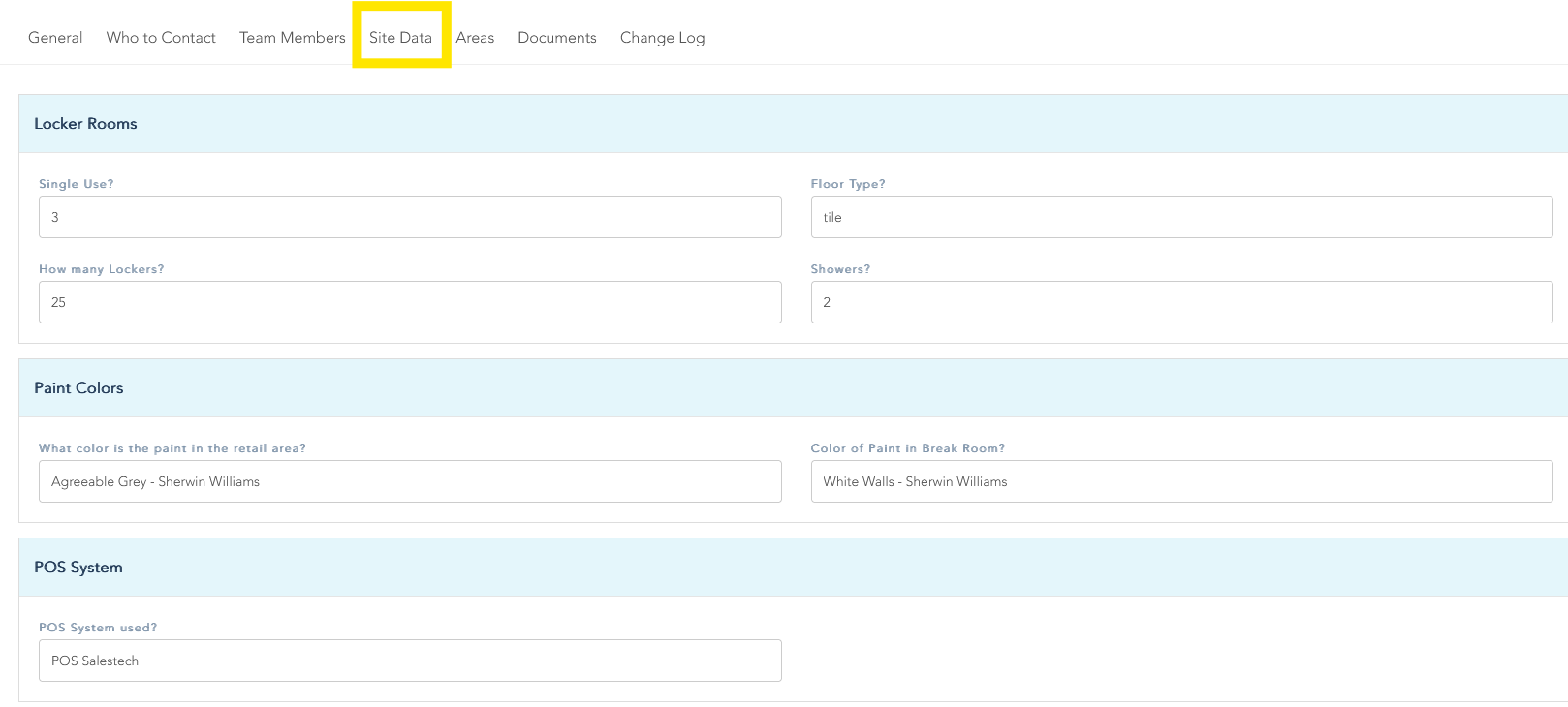 The Location "Site Data" Tab allows you to create sections for your locations to provide a centralized view of all site-specific information. Site Data is a separate Security permission. By default, users will not have access to view or edit Site Data.