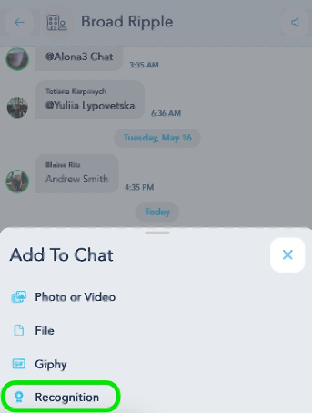 - You can give Recognition through the Quick Action Give Recognition button, or through Team and Private Chat.
