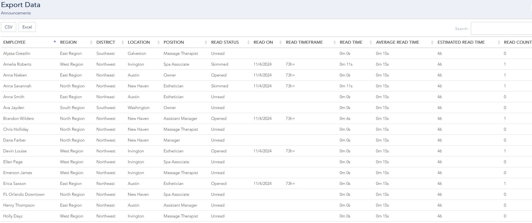 By clicking on the three dots, you can review excel data for the Team Members that were targeted for the announcement: