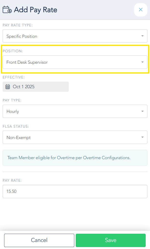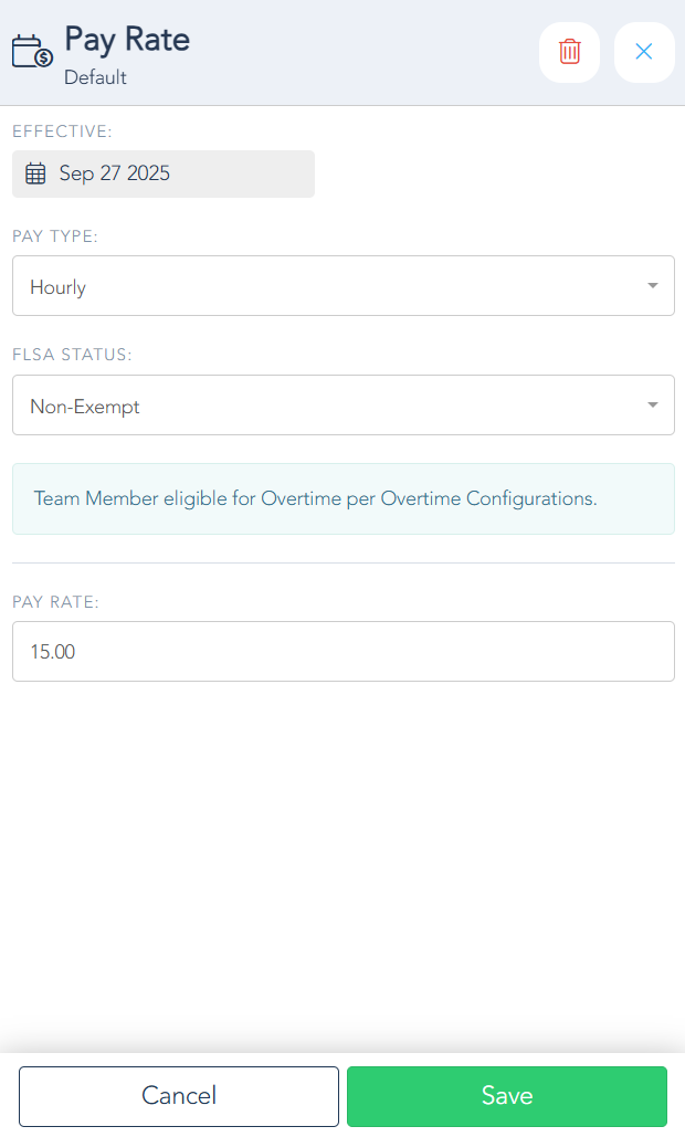 Here, you can manage the Team Member's pay rates by position, FLSA status, and time period.