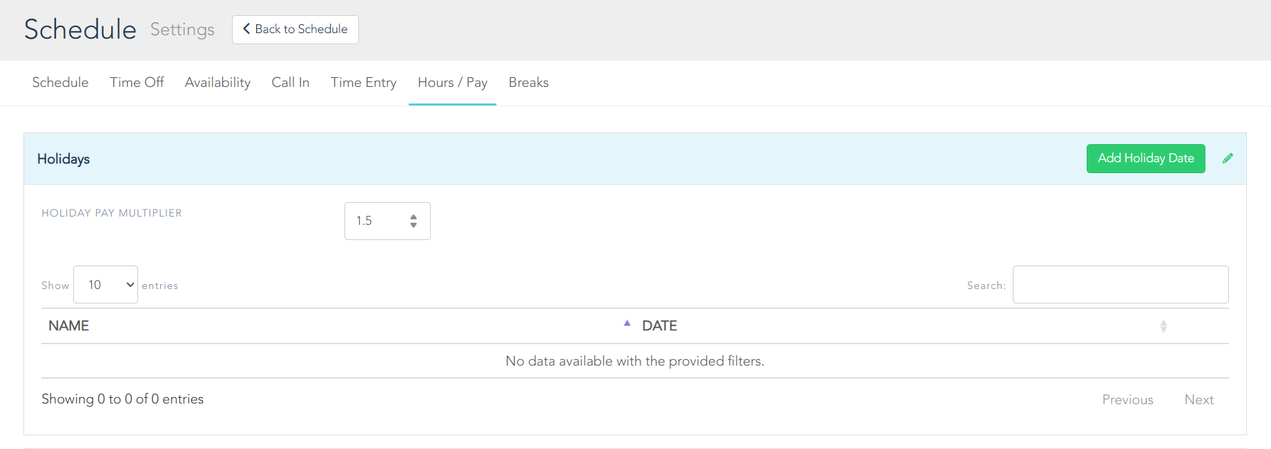 In Schedule Settings in the Hours/Pay tab, you can manage Holidays.