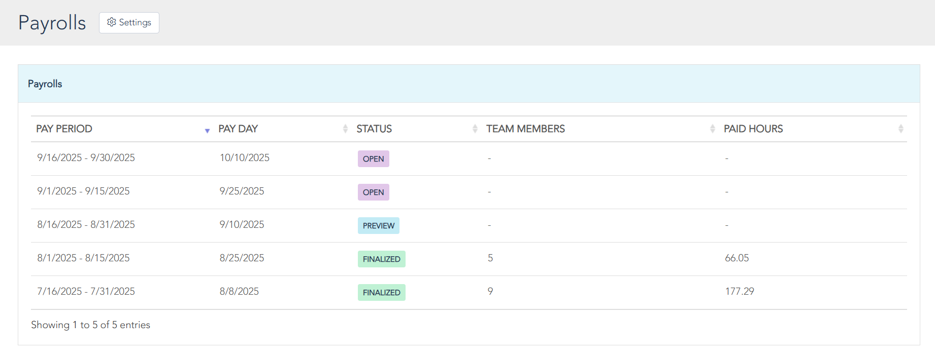 After setup, Woven will recognize and display your pay periods, pay days, status of the period, number of team members with time entries on the period, and paid hours.