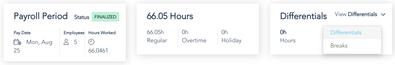 Selecting a Pay Period will display Payroll Period details, total, regular, holiday hours, and differential or break details.