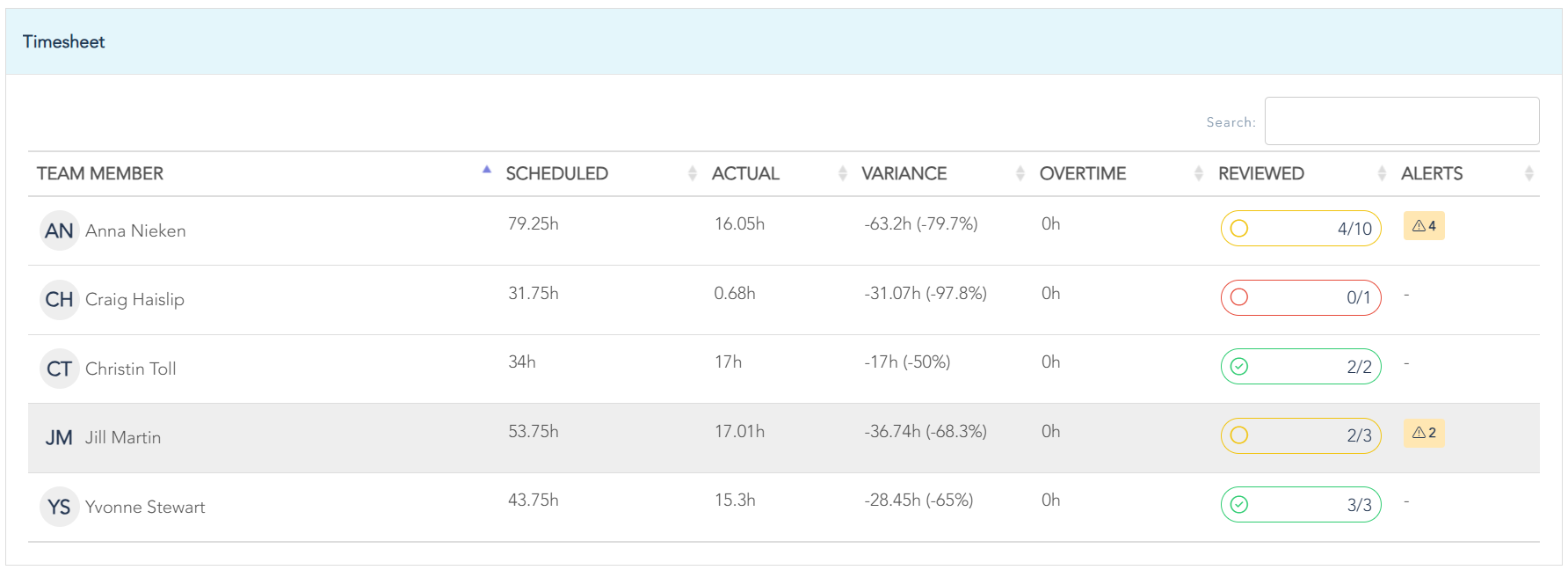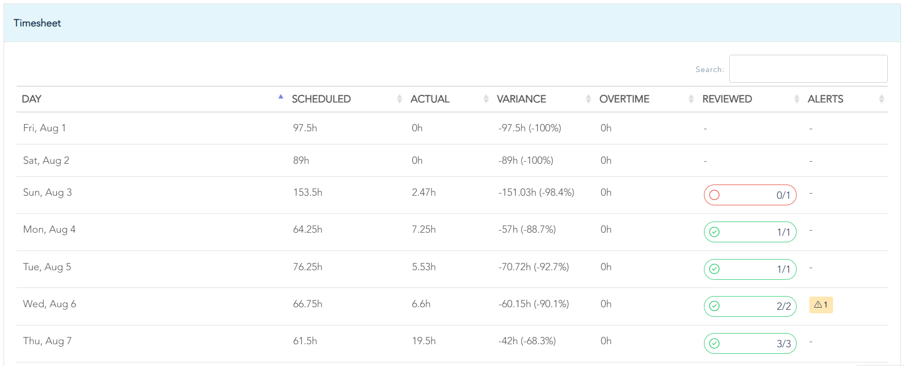 In the Timesheet table, you can filter by location or review all entries by Day or Team Member