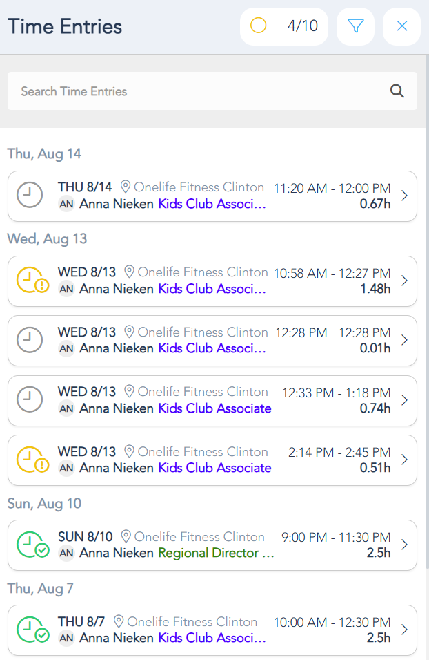 In either view you can easily review and adjust entries, as well as, review and clear alerts. To do this, select a day or team member row to display the Time Entires side panel.