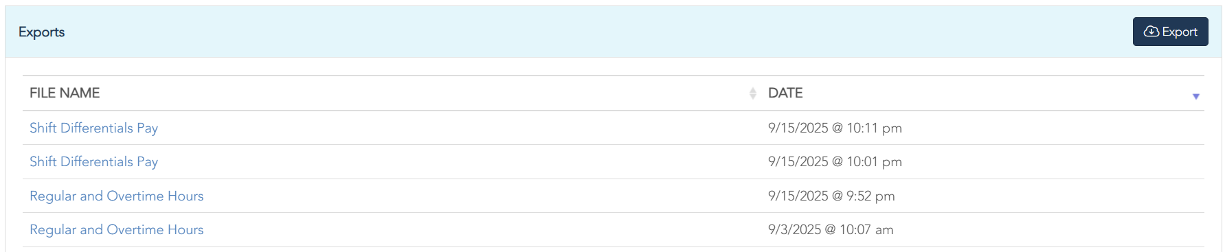 When Payroll is finalized, you will have access to Shift Differentials Pay and Regular and Overtime Hours Exports