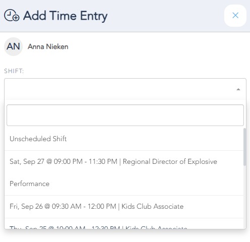 - From the dropdown menu, you can select Unscheduled Shift to add an unscheduled entry or choose from the scheduled shifts.