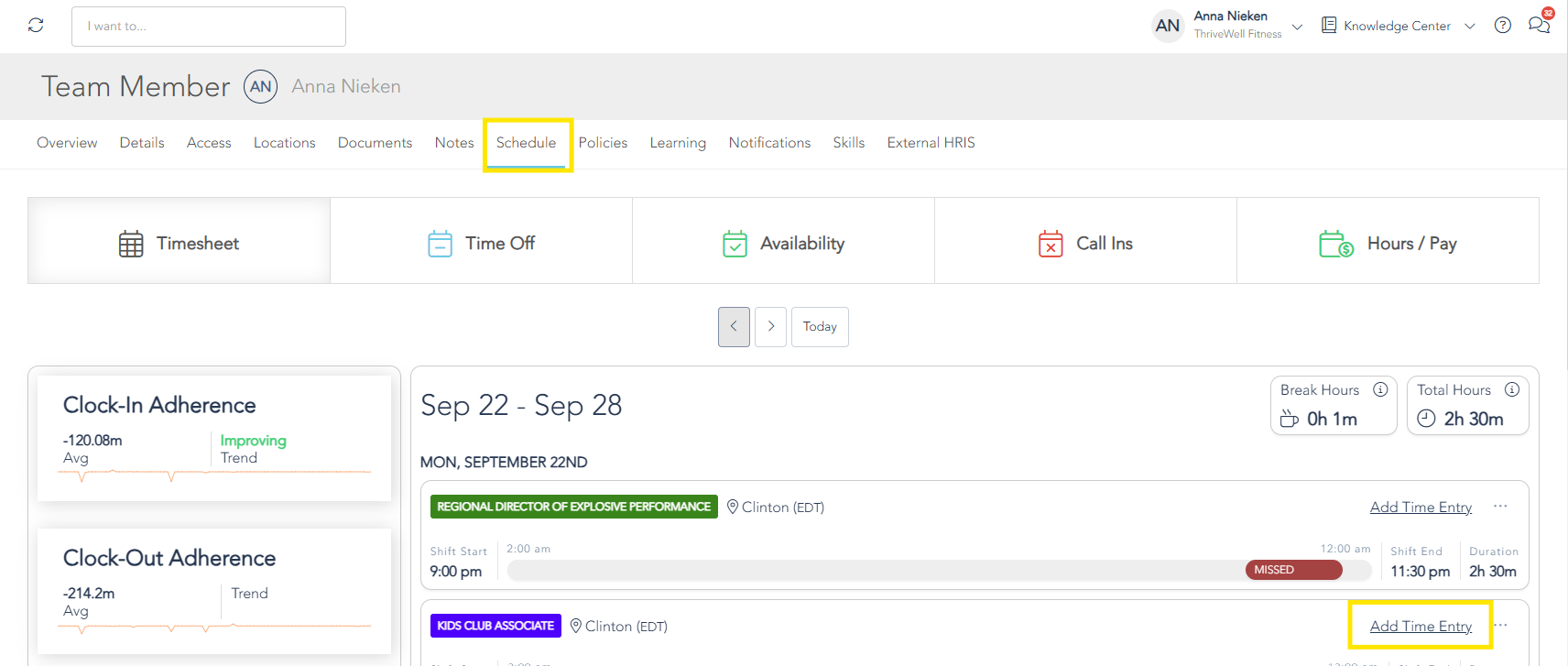 Managers can add Time Entries on behalf of their Team Members from Schedule Timesheets or from Timesheets within the Team Member's profile.