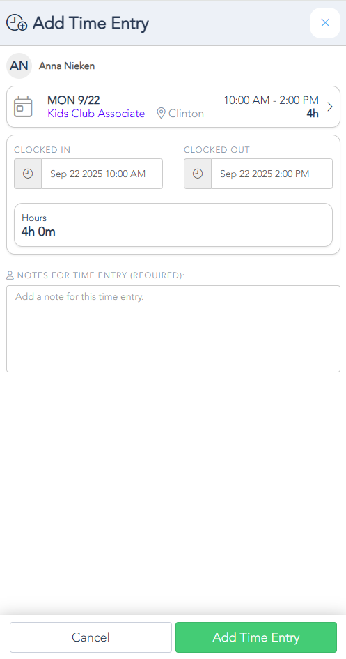 - For scheduled entries, add notes and select the green "Add Time Entry" button.