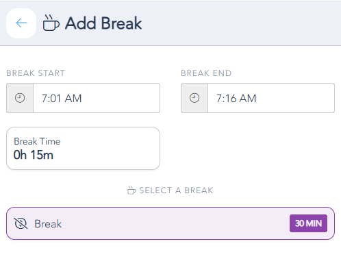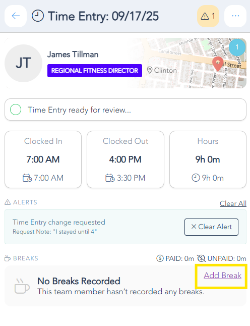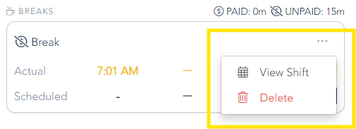 - Select the three-dot ellipses menu found within the Breaks section on the time entry.