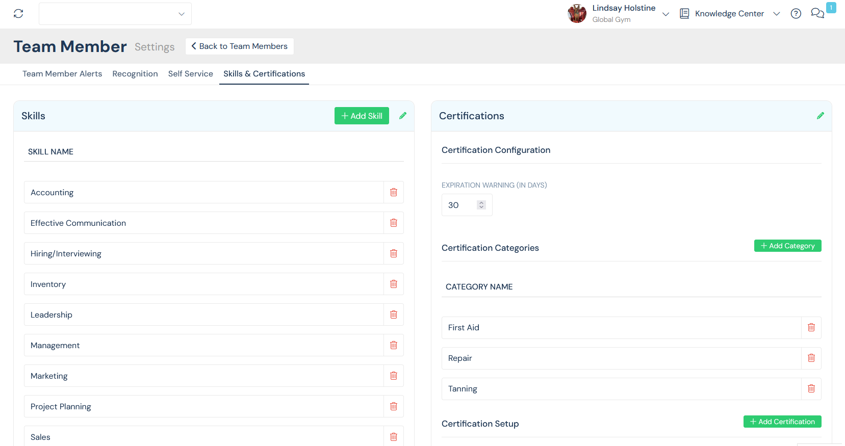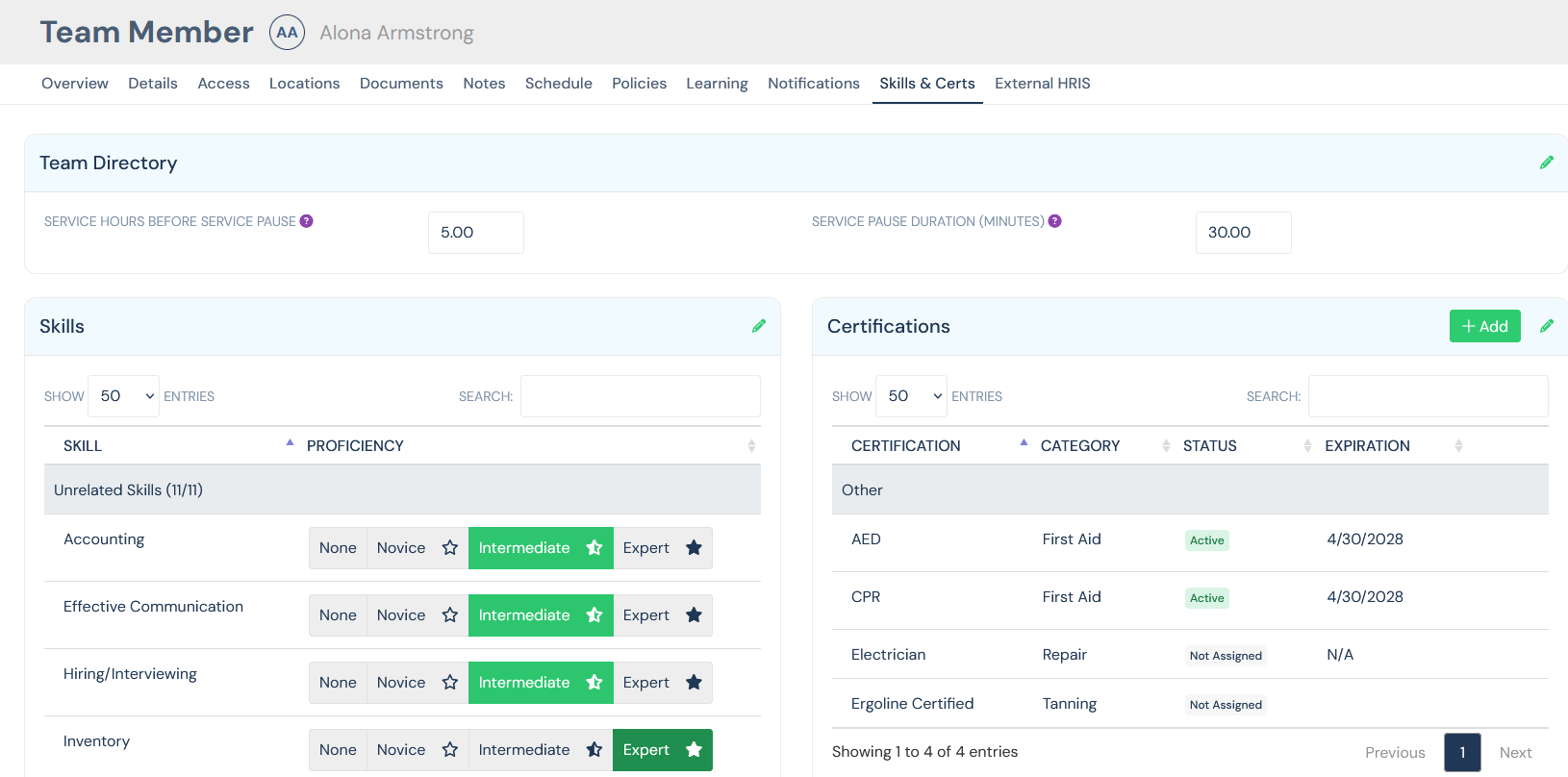 - Go to Team Member Settings → Skills & Certifications.